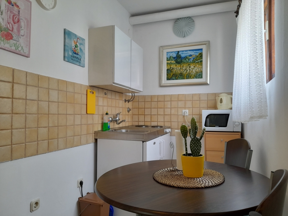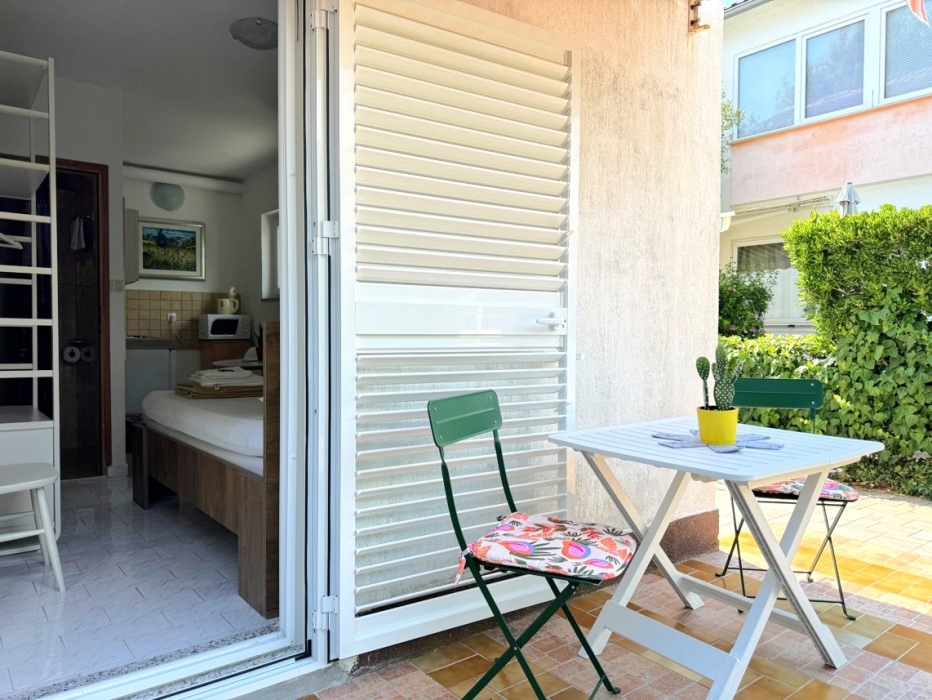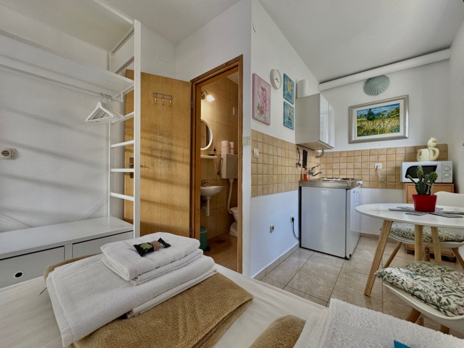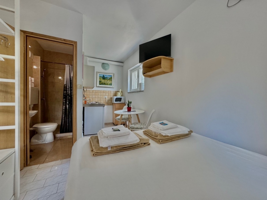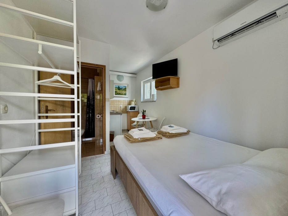 Smješten u šarmantnom i slikovitom dijelu grada Krka, ovaj primamljivi studio ima bračni krevet i kompaktnu čajnu kuhinju - sve unutar promišljeno uređenog otvorenog prostora. Kuća se nalazi na idealnoj lokaciji, samo 5 minuta hoda od plaže i 10 minuta hoda od centra mjesta. Gostima je na raspolaganju prostrana terasa, okružena bujnom mediteranskom vegetacijom, koja nudi miran ambijent za objedovanje na otvorenom ili jednostavno uživanje u mirnom okruženju.