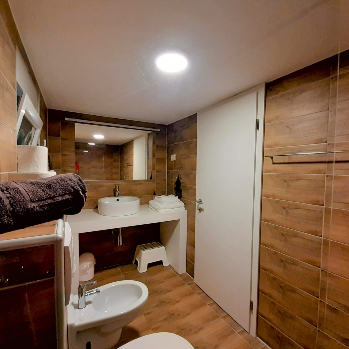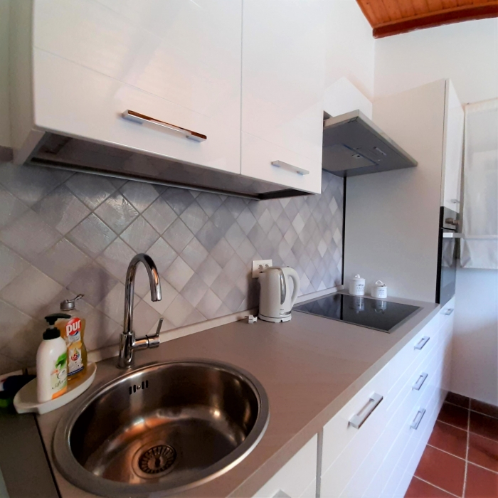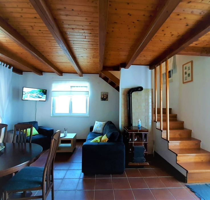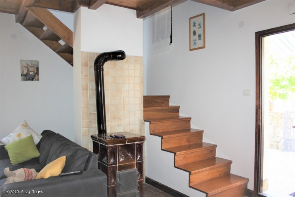 Casa vacanze 4+1 si sviluppa su due livelli. Il livello inferiore, piano terra è composto dal soggiorno e dalla cucina completamente attrezzata con tutti gli elettrodomestici necessari. Poche scale più in basso, nel seminterrato si trovano bagno con la doccia e camera da letto dotata di due letti singoli che possono essere trasformati in un letto matrimoniale. Il primo piano, mansardato è composto da una camera da letto spaziosa e climatizzata, con un letto matrimoniale e due divani letto. Dalla cucina / soggiorno si accede direttamente alla terrazza, giardino e piscina.