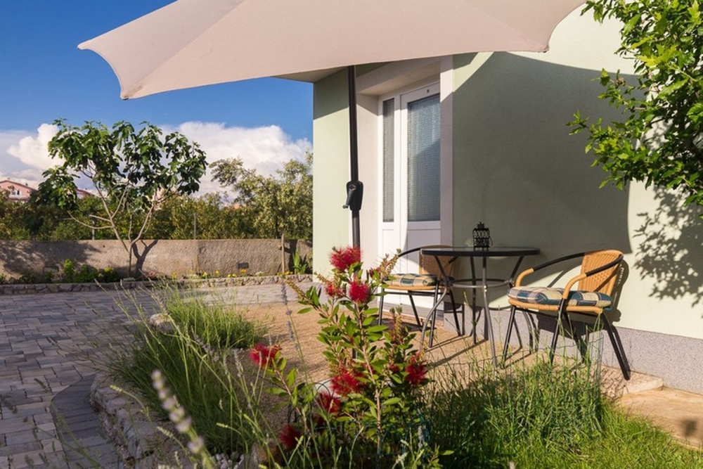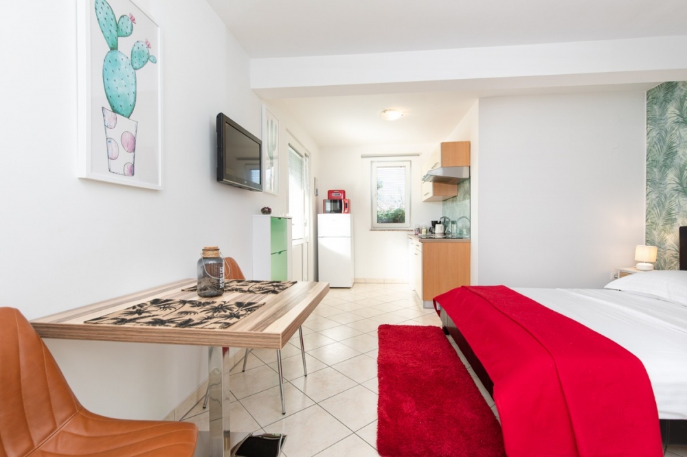 Studio 2 si trova al piano terra e con una superficie totale di 20 metri quadrati offre una sistemazione ideale per 2 persone. La cucina è attrezzata con fornello elettrico, lavastoviglie, frigorifero, macchina per il caffè e tutti gli utensili necessari. L'appartamento offre un accesso diretto al patio circondato da una vegetazione lussureggiante e mediterranea. Lo studio ha un ingresso separato. Il fumo è consentito solo al di fuori l'appartamento, sulla terrazza/balcone.