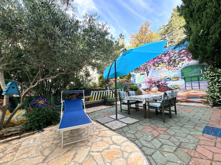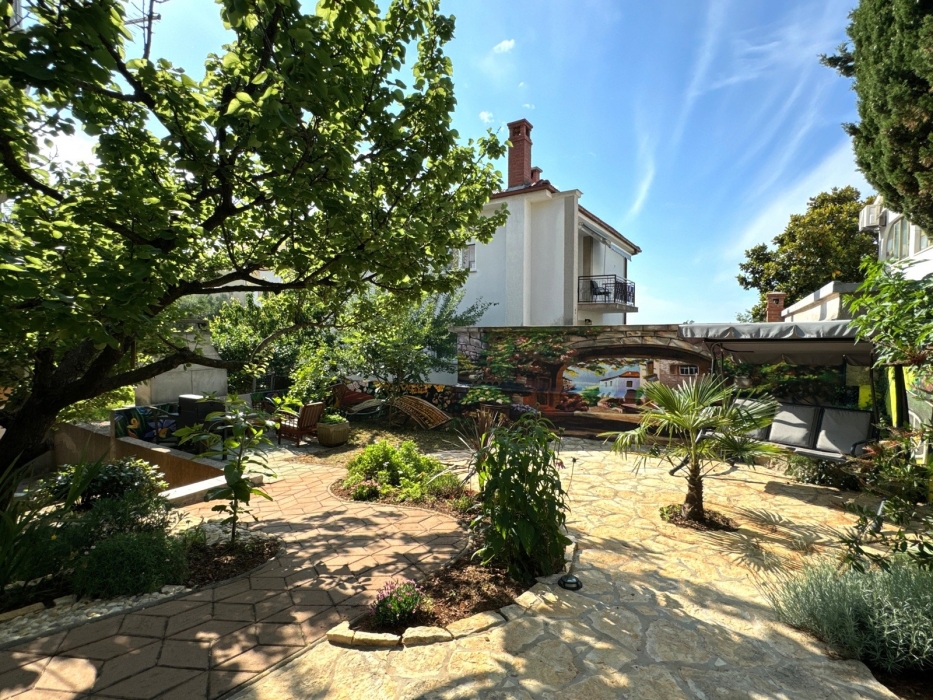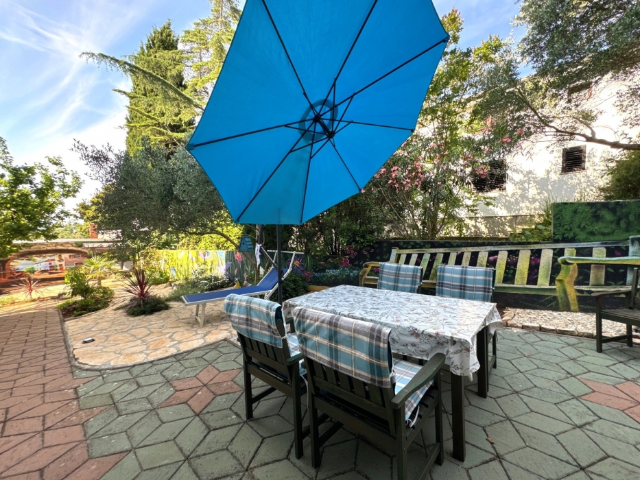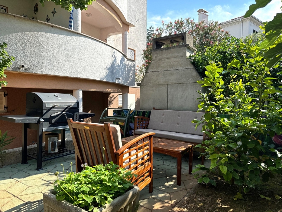 Appartamento 4+1 si trova al piano terra (soppalco) e può ospitare fino a 5 persone. L'appartamento è composto da una spaziosa camera matrimoniale con accesso diretto al giardino attrezzato con gazebo, mobili da giardino e sdraio e da una camera con due letti singoli. C'è la possibilità di ospitare un'altra persona nel soggiorno. Dal soggiorno si accede direttamente al balcone arredato. La cucina è attrezzata con fornello elettrico, frigorifero, macchina per caffè espresso, forno a microonde, lavastoviglie e tutti gli utensili necessari. Il bagno è composto da walk-in doccia, lavabo e lavatrice.