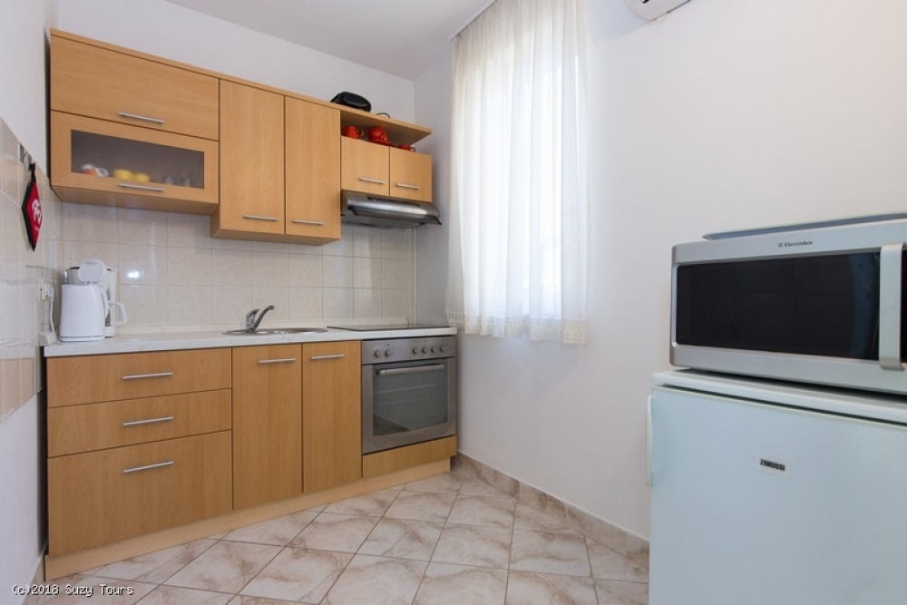 Appartamento nr. 1 si trova al piano terra e con una superficie di 45 metri quadrati offre alloggio ideale per due persone. Appartamento e composto da una camera da letto, bagno e soggiorno. La cucina ha un fornello, frigorifero, forno a microonde, macchina per il caffè e tutti gli utensili necessari. Il soggiorno ha accesso diretto al balcone con vista sul mare e le mura della città. Il fumo è consentito solo al di fuori della casa, sul terrazzo / balcone.