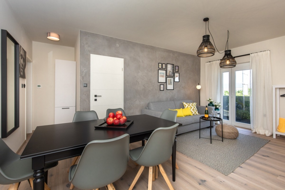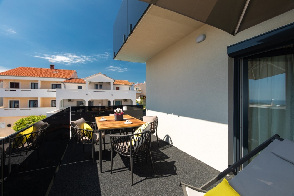 Appartamento nr. 2 si trova al primo piano e con una superficie totale di 65 mq, l'appartamento offre una sistemazione ideale per 4 persone. Appartamento composto da due camere da letto, soggiorno con divano letto, bagno con cabina doccia e servizi igienici extra. La cucina è dotata di tutti gli elettrodomestici necessari e comprende lavastoviglie, forno, macchina per il caffè e tostapane. La terrazza attrezzata con tavolo e offre una splendida vista sul mare.