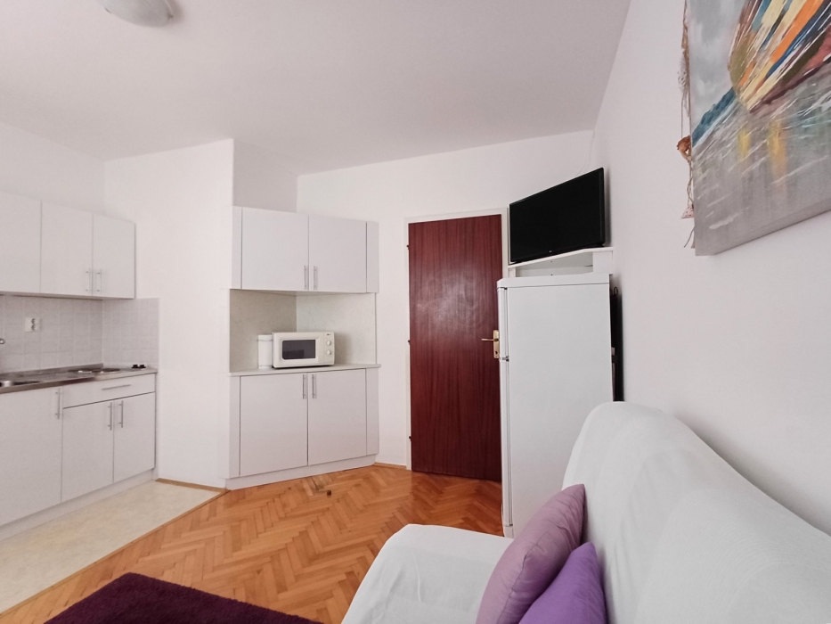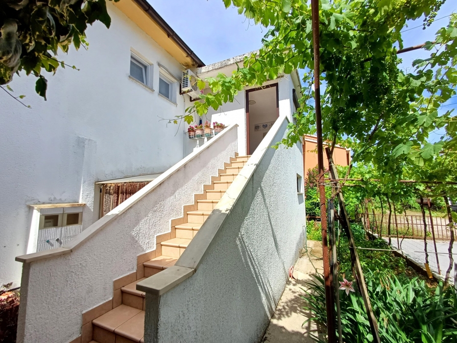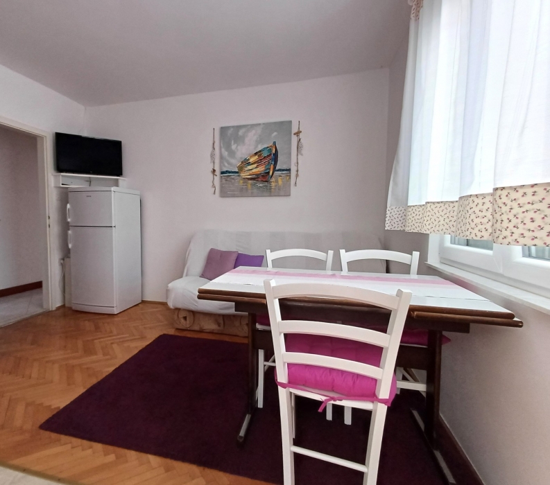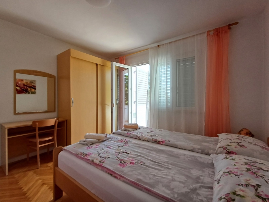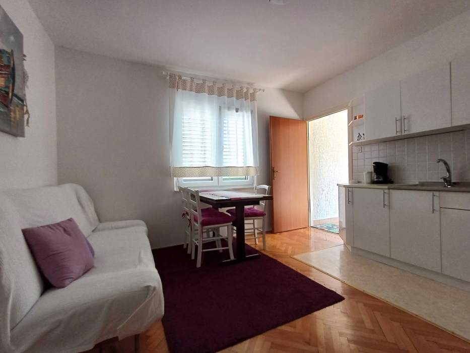 L'appartamento 2+1 è situato al primo piano e con una superficie totale di 50 metri quadrati, l'appartamento offre una sistemazione ideale per un massimo di 3 persone. L'appartamento è composto da un unico ambiente con letto matrimoniale + letto singolo e cucina con divano letto. La cucina è attrezzata con fornello elettrico, frigorifero, macchina per il caffè con filtro, bollitore elettrico e tutte le stoviglie necessarie. Dalla camera si accede alla terrazza con un'incantevole vista sul mare.